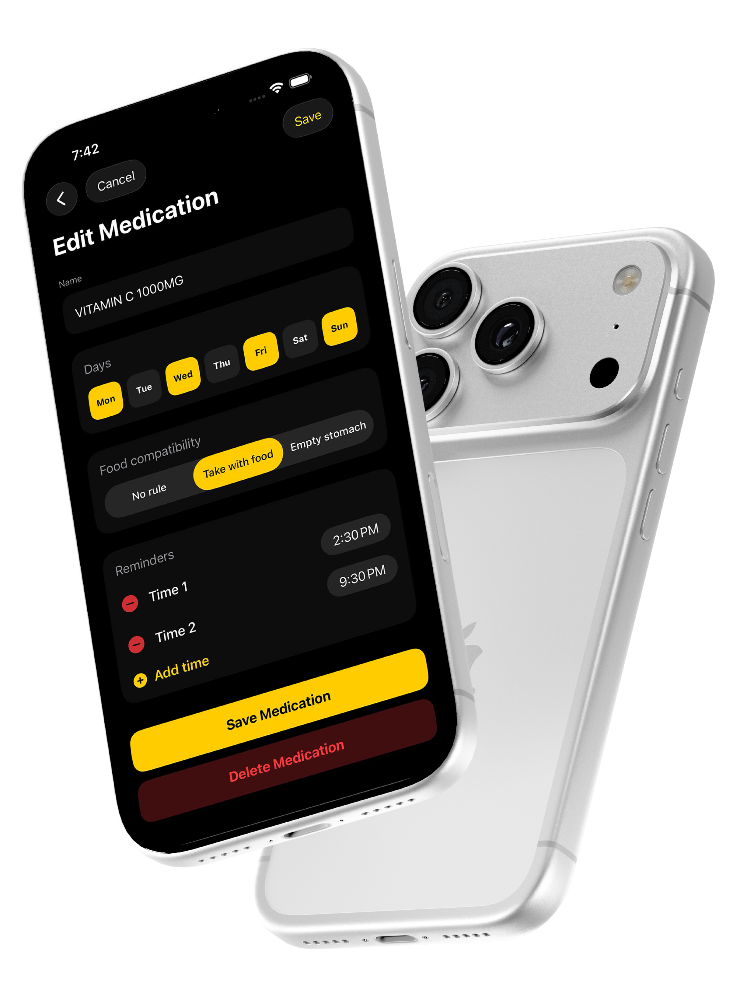 Easily add and edit your medications, choose the days you take them, set multiple reminders, and define food compatibility. A simple and clean way to stay consistent and never miss a dose.